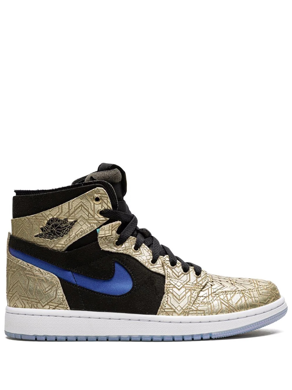 Air Jordan 1 Zoom CMFT GC "Gold Laser" sneakers The new Air Jordan 1 Zoom CMFT "Gold Laser", stands out thanks to its laser-etched overlays. This high-top sneaker appears with a metallic gold-tone, while black adorns the panels, laces, collar, and padded tongue. The usual Swoosh appears on the sides in a blue tone. The silhouette is completed by a rubber sole with translucent trimming. Imported Composition Leather 100%
