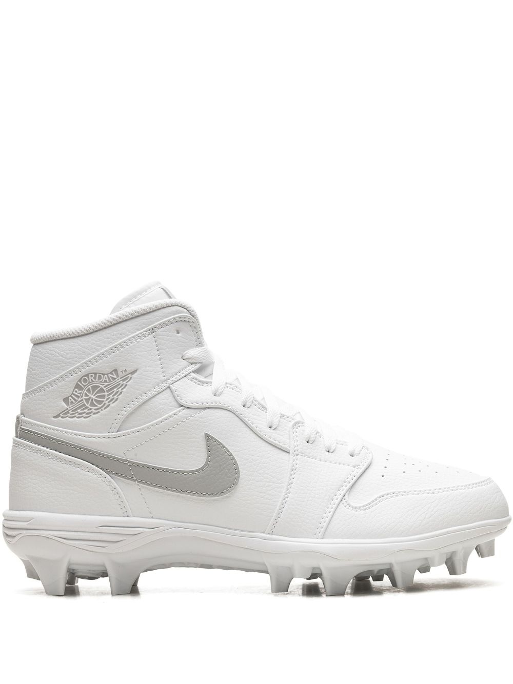Jordan 1 Mid "White Grey Fog" cleats Highlights - White - Front lace-up fastening - Ankle-length - Signature air jordan wings logo - Signature swoosh logo detail - Signature jumpman motif - Perforated toebox - Round toe - Branded insole - Studded sole - These styles are supplied by a premium and authenticated sneaker marketplace. stocking only the most sought-after footwear, they source and curate some of the most hard to find sneakers from around the world. Imported Composition Sole: Rubber 100% Outer: Polyurethane 100% Lining: Fabric 100%