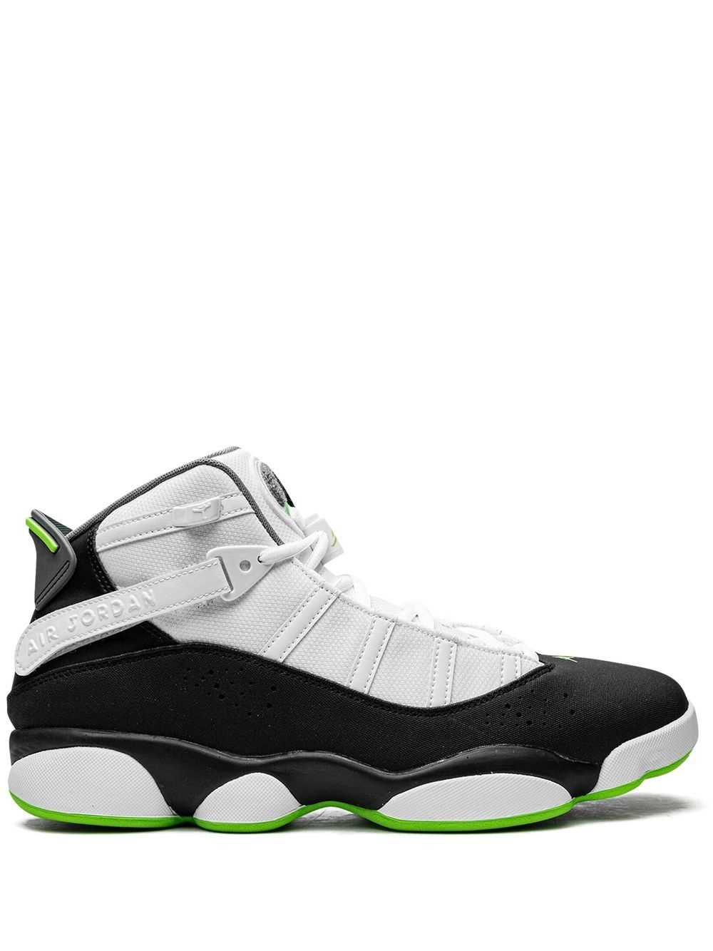 Jordan 6 Rings "Altitude Green" sneakers The iconic Jordan 6 Rings now arrive in white, black, grey and green colourway. This high-top sneaker is crafted from leather, highlighted with a Jumpman logo at the rear and tongue, and sits atop a rubber sole for comfort and traction. Highlights - Black/white - Signature jumpman motif - Contrasting panel detail - Round toe - Front lace-up fastening - Logo patch at the tongue - Side touch-strap fastening - Pull-tab at the heel - Branded insole - Rubber sole - These styles are supplied by a premium sneaker marketplace. stocking only the most sought-after footwear, they source and curate some of the most hard to find sneakers from around the world. Imported Composition Sole: Rubber 100% Outer: Fabric 100% Lining: Fabric 100%