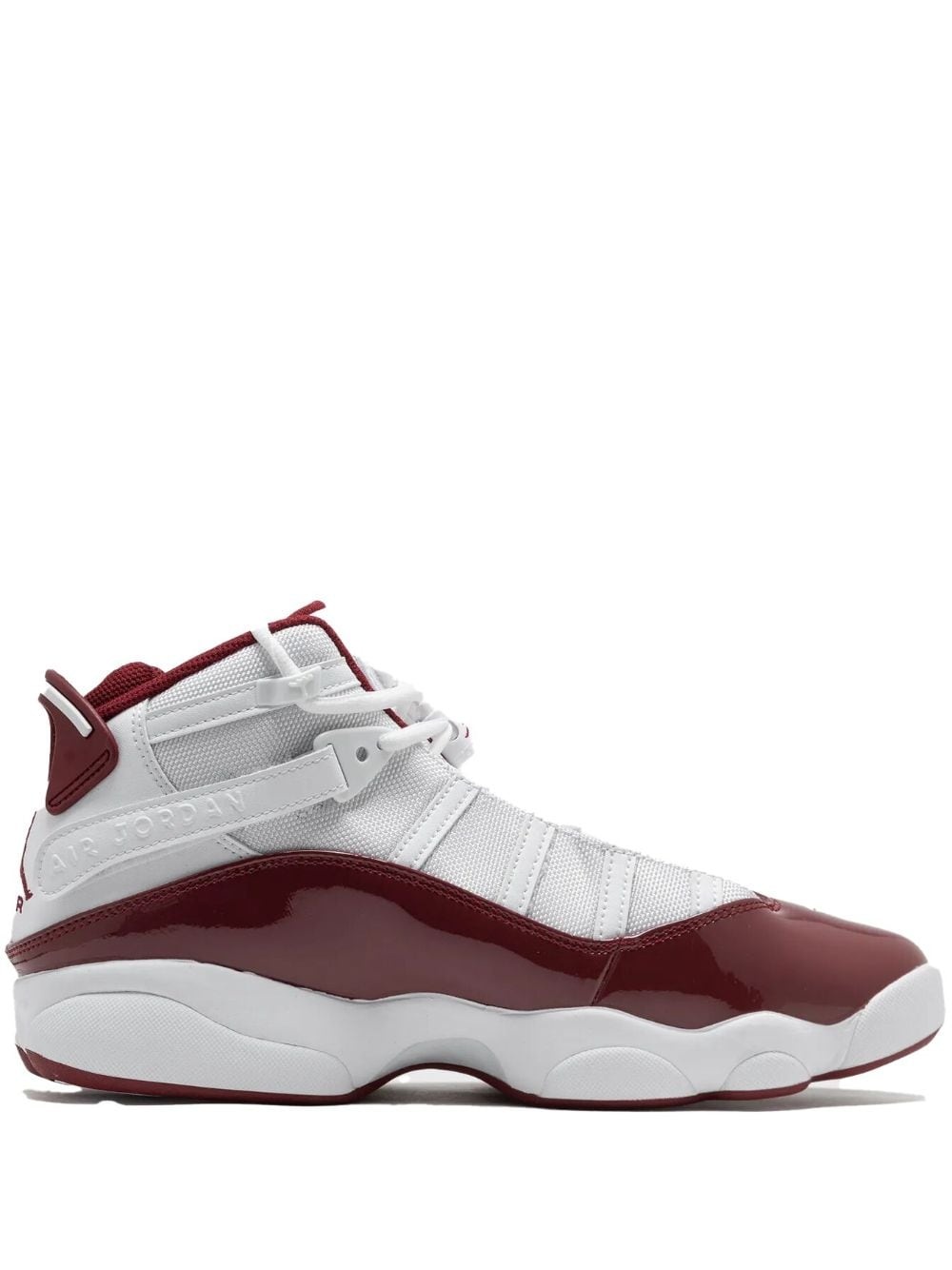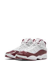 Jordan 6 Rings "Red" sneakers Highlights - White/red - Leather - Patent finish - Signature jumpman motif - Round toe - Front lace-up fastening - Side touch-strap fastening - Branded insole - Rubber sole - These styles are supplied by a premium and authenticated sneaker marketplace. stocking only the most sought-after footwear, they source and curate some of the most hard to find sneakers from around the world. Imported Composition Sole: Rubber 100% Outer: Leather 100%, Patent Leather 100%, Fabric 100% Lining: Fabric 100%