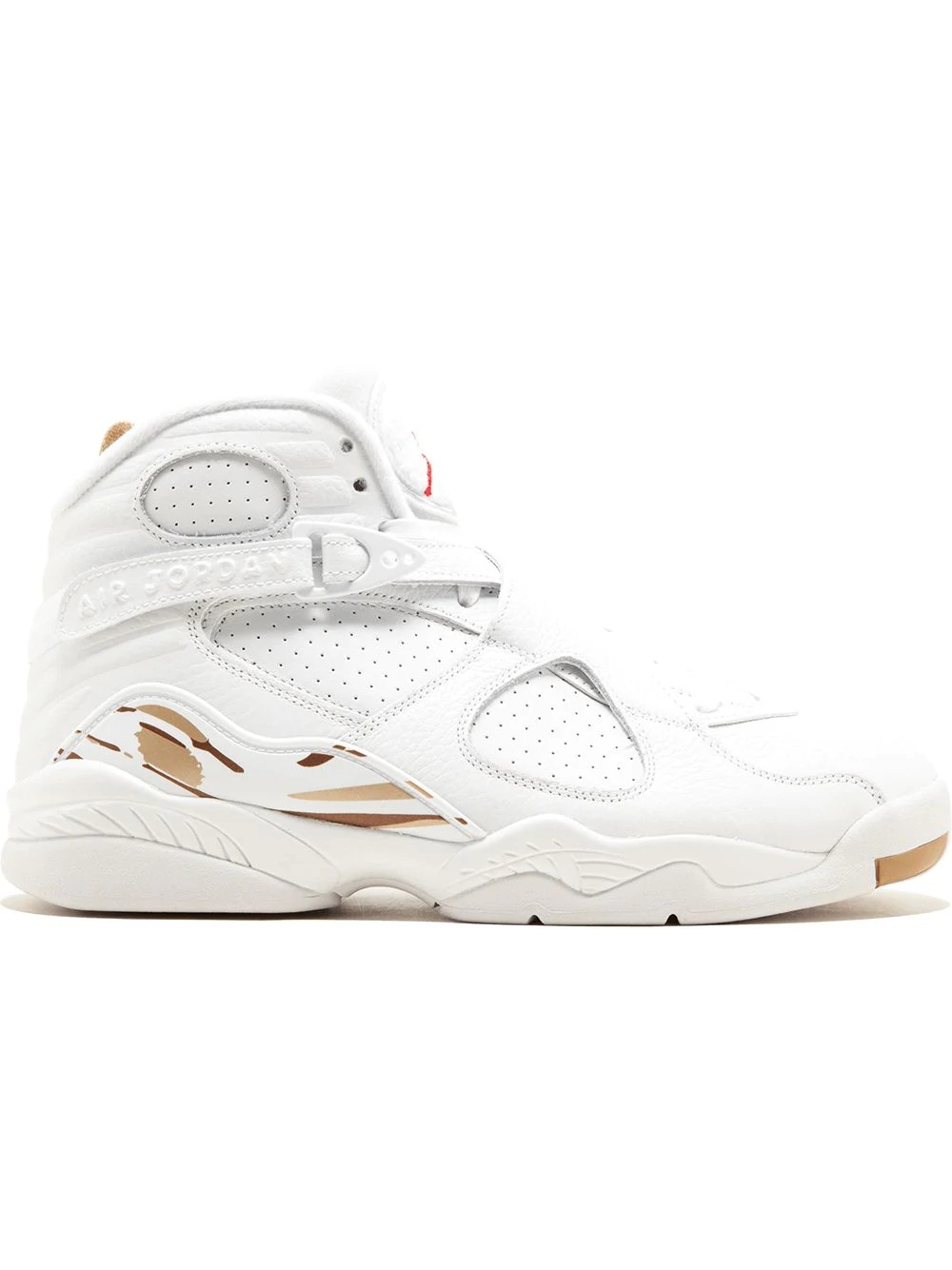 x OVO Air Jordan 8 Retro "White" sneakers After what seemed like years of looks at samples and pairs only on Drake’s feet, the OVO x Air Jordan 8 finally dropped in early 2018 in white and black leather colorways accented with metallic gold. Available here is the white edition, featuring an elegant look for the eighth Air Jordan in a white full-grain leather upper with golden and red detailing throughout. The Air Jordan 8 OVO is already viewed by many as Drake’s best offering from Jordan Brand so far, and pairs were very limited, so of course, demand is high. Grab your pair now before they’re gone. Imported Composition Calf Leather 100%