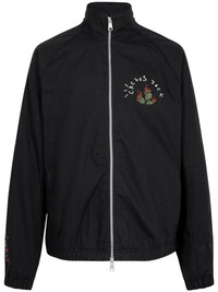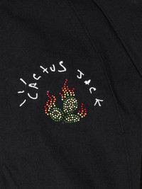 x Travis Scott graffiti print jacket Jordan is back with another collaboration with American rapper Travis Scott. In this zip-up jacket, Scott reimagines the classic Flight logo with a neon effect - on the back - while fiery motifs with rhinestone embellishment decorate the chest. Imported Composition Cotton 100%
