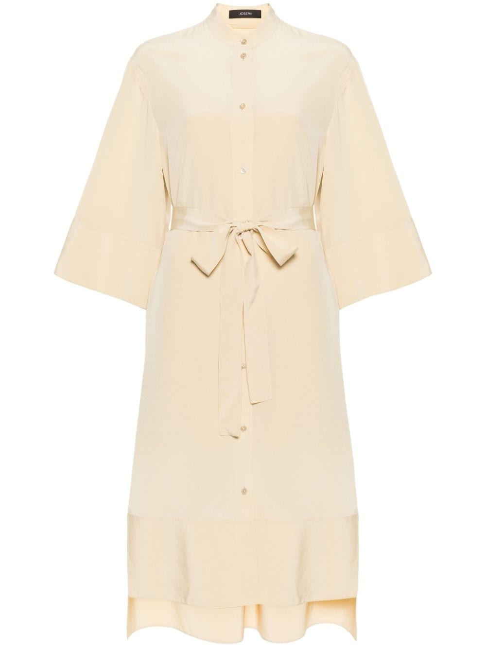 collarless silk dress Highlights - Light yellow - Silk - Collarless - Front button fastening - Belted waist - Front tie fastening - Short sleeves - High-low hem - Mid-length Imported Composition Lining: Silk 100% Outer: Silk 100% SIZE & FIT Model measurements Height 5 ft 11 in(1.8 m) Bust/Chest 33.07 in(84 cm) Hips 37.4 in(95 cm) Waist 25.19 in(64 cm) FittingInformation Designed to be unstructured, offering a loose fit throughout The detachable slip sits just away from the body, offering a close yet comfortable fit Made from a midweight non-stretch fabric This piece fits true to size – take your usual size Washing instructions Dry Clean Only