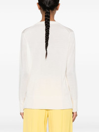 long-sleeve jumper Highlights - Cream white - Merino-silk blend - Knitted construction - Fine knit - Round neck - Long sleeves - Ribbed cuffs and hem - Short side slits - Straight hem Imported Composition Merino 70%, Silk 30% SIZE & FIT Model measurements Height 5 ft 9 in(1.76 m) Bust/Chest 31.1 in(79 cm) Hips 36.61 in(93 cm) Waist 24.8 in(63 cm) FittingInformation Designed for a relaxed fit, this piece allows for comfort and movement when worn Made with a midweight knit, this piece offers some stretch This piece fits true to size – take your usual size Washing instructions Hand Wash