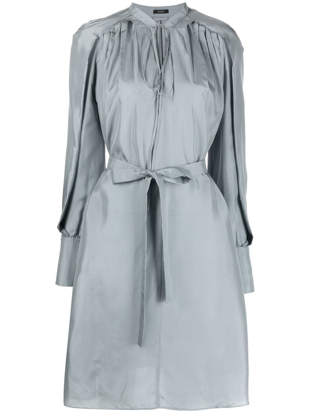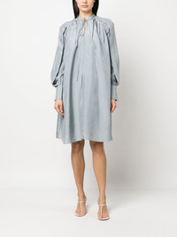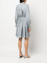 long-sleeve silk dress heather grey silk satin band collar storm flap long sleeves fully pleated tied waist mid-length Imported Composition Silk 100% SIZE & FIT Model measurements Height 5 ft 11 in(1.8 m) Bust/Chest 33.07 in(84 cm) Hips 37.4 in(95 cm) Waist 25.19 in(64 cm) Measurement SLEEVE LENGTH 18.11 in(46 cm) LENGTH 39.37 in(100 cm) FittingInformation This piece fits true to size. We recommend you get your regular size Cut for a loose fit. Comes with an adjustable belt for a flexible fit at the waist Made with a lightweight non-stretch fabric