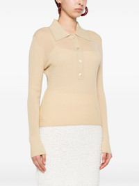 ribbed wool polo top Highlights - Taupe - Merino wool - Stretch-design - Knitted construction - Fine ribbed - Polo collar - Long sleeves - Straight hem - Short front button fastening Imported Composition Merino 100% SIZE & FIT Model measurements Height 5 ft 11 in(1.8 m) Bust/Chest 33.07 in(84 cm) Hips 37 in(94 cm) Waist 25.59 in(65 cm) Measurement SLEEVE LENGTH 24.01 in(61 cm) LENGTH 22.83 in(58 cm) WAIST 29.92 in(76 cm) FittingInformation Designed for a slim fit that sits just away from the body offering a close yet comfortable fit Made with a midweight knit, this piece offers some stretch This piece fits true to size – take your usual size