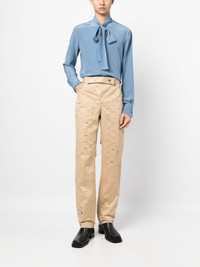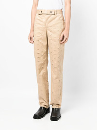 ripped straight-leg trousers Highlights - Beige - Cotton blend - Ripped detailing - Logo patch to the rear - Belt loops - Front button fastening - Mid-rise - Straight leg - Two side inset pockets - Two rear patch pockets Imported Composition Body: Cotton 97%, Polyurethane 3% SIZE & FIT Model measurements Height 6 ft 2 in(1.87 m) Bust/Chest 31.49 in(80 cm) Hips 37.79 in(96 cm) Waist 27.95 in(71 cm) FittingInformation Designed for a straight-leg, allowing for an unrestricted and comfortable fit over the leg Made from a midweight non-stretch fabric, this piece offers minimal elasticity when worn This piece fits true to size – take your usual size