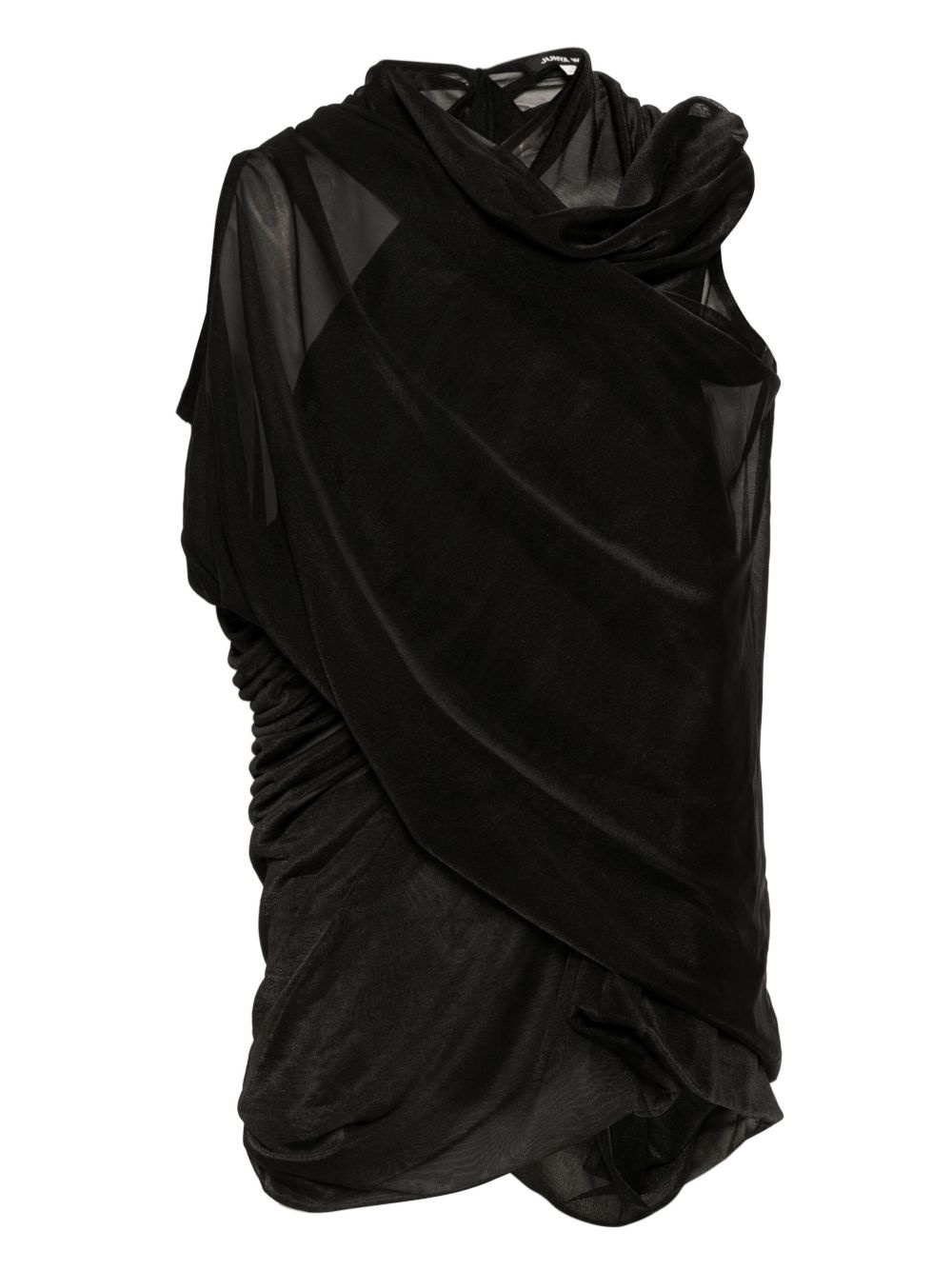 asymmetric top Highlights - Black - Short sleeves - Asymmetric design - Semi-sheer overlay Imported Composition Polyester 100% Washing instructions Hand Wash