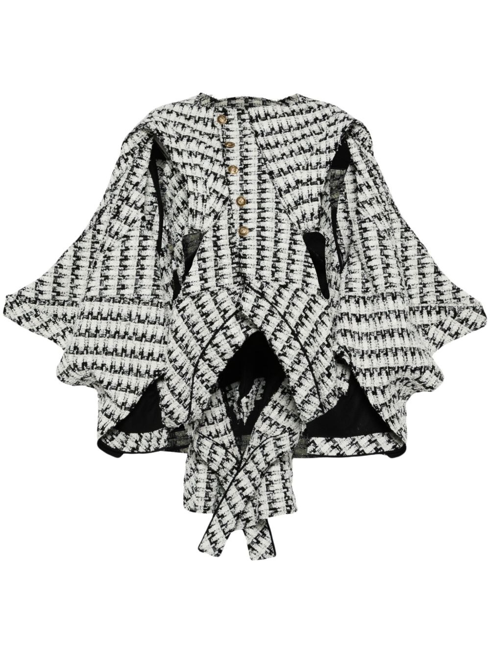 asymmetric tweed jacket Highlights - White/black - Tweed - Asymmetric design - Cape design - Cut-out detailing - Gold-tone buttons - Square neck - Front button fastening - Long sleeves - Asymmetric hem Imported Composition Outer: Nylon 36%, Rayon 33%, Wool 16%, Cotton 13%, Polyester 2% Lining: Polyester 100%