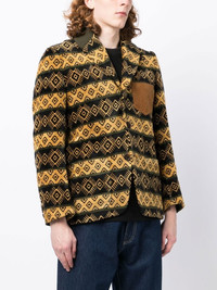 geometric-pattern shawl-lapel jacket black/yellow/dark green corduroy ribbed trim geometric-pattern print shawl lapels front button fastening long sleeves straight hem chest patch pocket two front patch pockets Imported Composition Body: Acrylic 80%, Polyester 20% SIZE & FIT Model measurements Height 6 ft 2 in(1.87 m) Bust/Chest 36.22 in(92 cm) Hips 37.79 in(96 cm) Waist 28.34 in(72 cm) FittingInformation This piece fits true to size. We recommend you get your regular size Cut for a loose fit Made with a mid-weight non-stretch fabric Washing instructions Dry Clean Only