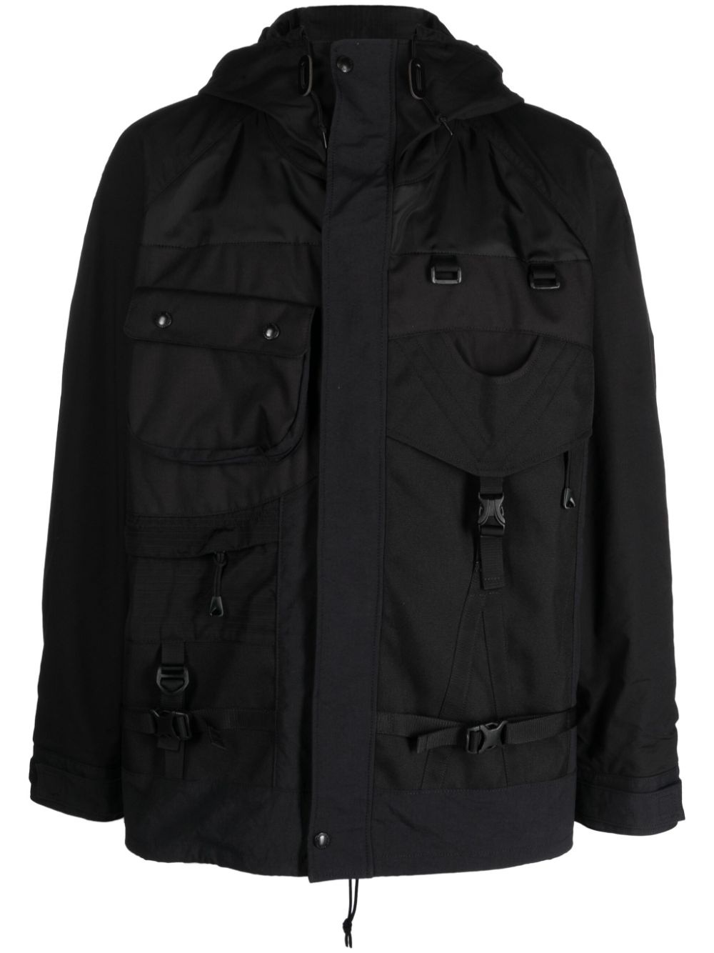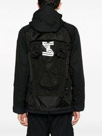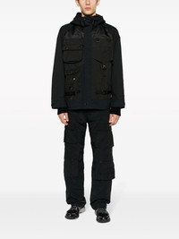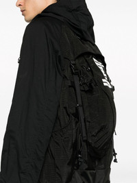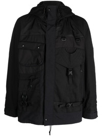 hybrid backpack utility jacket Highlights - Black - Ripstop texture - Logo print to the rear - Quick-release buckle strap detailing - Stand-up collar - Classic hood - Front press-stud and zip fastening - Long sleeves - Touch-strap cuffs - Multiple cargo pockets - Attached backpack Imported Composition Outer: Rayon 100%, Nylon 88%, Polyester 12% Lining: Wool 100%, Polyester 100%, Nylon 100% SIZE & FIT Model measurements Height 6 ft 2 in(1.87 m) Bust/Chest 36.41 in(92.5 cm) Hips 35.43 in(90 cm) Waist 29.52 in(75 cm) FittingInformation Designed for a relaxed fit, this piece allows for comfort and movement when worn The internal drawstring at the hem allows for fitted preferences Made from a midweight non-stretch fabric This piece fits true to size – take your usual size Washing instructions Dry Clean Only