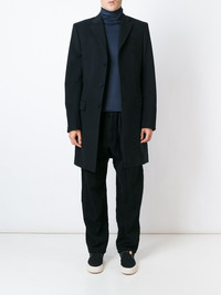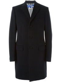 Men's Coat Long Length, single breasted wool mix coat. Features three self fabric covered buttons and key hole button holes on centre front, and four on cuff. Also features two flap pockets with top stitch detail on front, and rear vent on back. Imported Composition Wool 70%, Cashmere 20% Lining: Cupro 100% SIZE & FIT Model measurements Height 6 ft 1 in(1.85 m) Bust/Chest 35.43 in(90 cm) Hips 39.37 in(100 cm) Waist 29.92 in(76 cm) Washing instructions Dry Clean Only