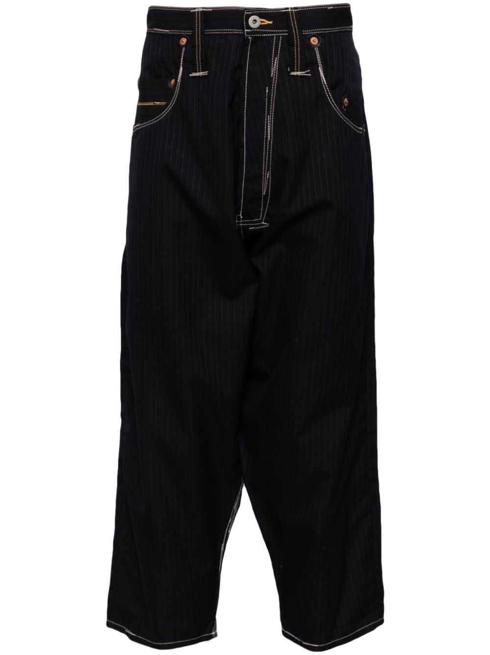 pinstripe wool trousers Highlights - Navy blue - Wool - Pinstripe pattern - Front button fastening - Belt loops - Contrast stitching - Classic five pockets - Coin pocket - Adjustable waist strap - Logo patch to the rear - Drop crotch Imported Composition Lining: Cupro 100% Outer: Wool 100% Washing instructions Dry Clean Only