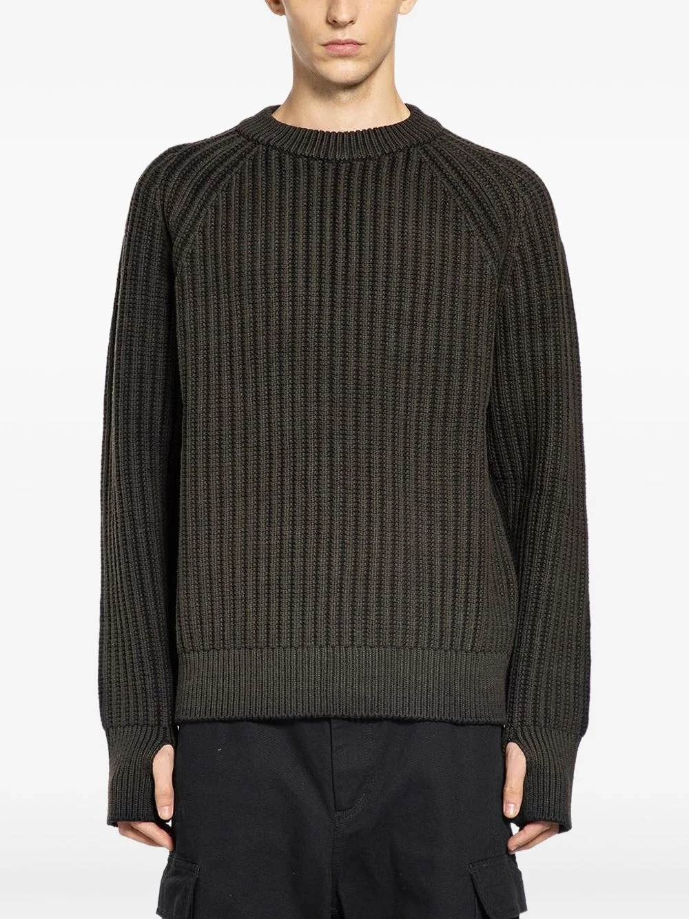 ribbed-knit sweater Highlights - Black - Ribbed knit - Thumbhole detailing - Round neck - Long sleeves Imported Composition Wool 100% Washing instructions Read Manufacturer Guidelines