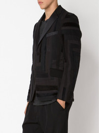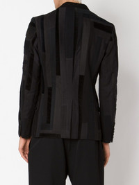stripped patchwork blazer Black wool, cotton and silk blend stripped patchwork blazer from Junya Watanabe Comme Des Garcons Man. Imported Composition Cotton 94%, Silk 36%, Wool 3% Lining: Cupro 64% SIZE & FIT Model measurements Height 6 ft 2 in(1.88 m) Bust/Chest 38.18 in(97 cm) Hips 33.07 in(84 cm) Waist 31.1 in(79 cm) Washing instructions Specialist Cleaning