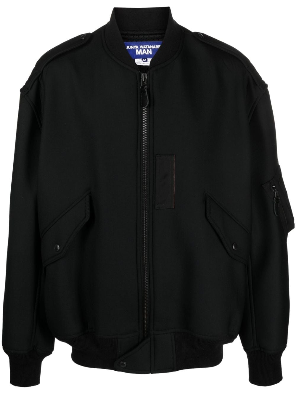 zip-up bomber jacket Highlights - Black - Tonal stitching - Stand-up collar - Front zip fastening - Long sleeves - Ribbed cuffs and hem - Two front flap pockets Imported Composition Lining: Polyester 65%, Rayon 35% Outer: Wool 100% SIZE & FIT Model measurements Height 6 ft 2 in(1.87 m) Bust/Chest 36.41 in(92.5 cm) Hips 37 in(94 cm) Waist 29.52 in(75 cm) FittingInformation Designed to be unstructured, offering a loose fit throughout Made from a midweight non-stretch fabric This piece fits true to size – take your usual size Washing instructions Dry Clean Only