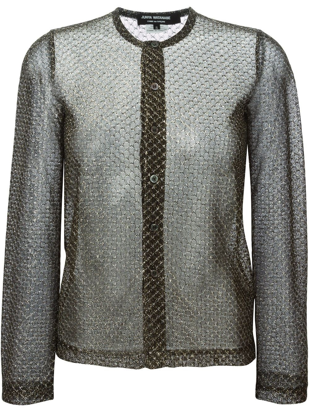 metallic sheen cardigan Black and gold-tone metallic sheen cardigan from Junya Watanabe Comme Des Garcons. Imported Composition Rayon 84%, Polyester 14%, Nylon 2% SIZE & FIT Model measurements Height 5 ft 10 in(1.79 m) Bust/Chest 32.67 in(83 cm) Hips 33.46 in(85 cm) Waist 24.01 in(61 cm) Washing instructions Dry Clean Only