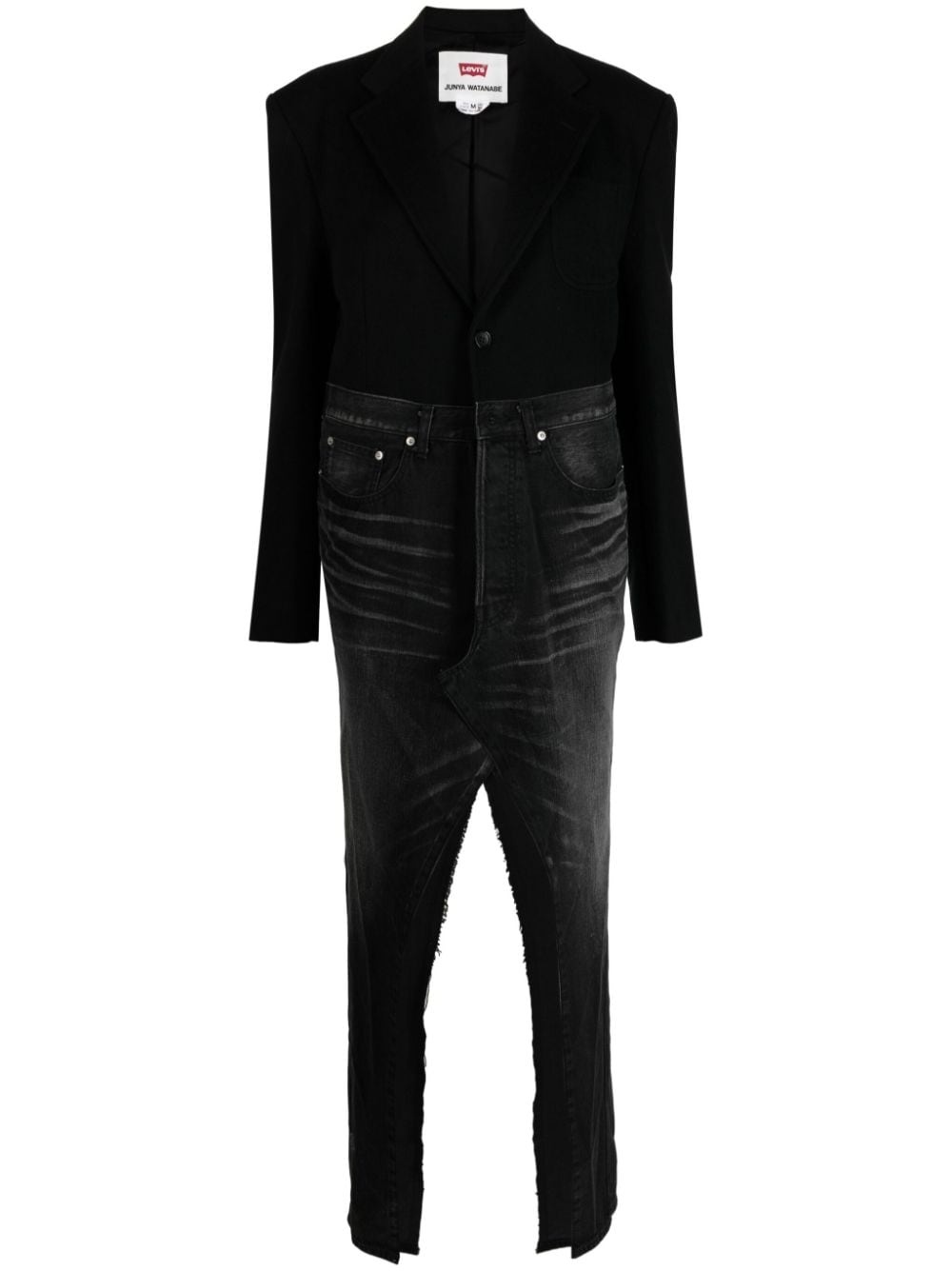 panelled V-neck coat Junya Watanabe's innovative vision is projected in this cotton and cashmere wool-blend coat. Featuring deep slits to the front and the back, the piece cleverly mimics a jacket and denim skirt in its unique panelled construction. Highlights - Black/blue - Cotton-cashmere blend - V-neck - Notched lapels - Front button fastening - Long sleeves - Buttoned cuffs - Front slit - Rear slit - Raw-cut edge Imported Composition Body: Cotton 100% Outer: Wool 90%, Cashmere 10% Lining: Cupro 100% SIZE & FIT Model measurements Height 5 ft 10 in(1.78 m) Bust/Chest 29.13 in(74 cm) Hips 35.43 in(90 cm) Waist 23.62 in(60 cm) FittingInformation Designed for a boxy fit, intended for a loose fit throughout The vented hem offers movement at the rear Made from a heavyweight non-stretch fabric This piece fits true to size – take your usual size Washing instructions Dry Clean Only