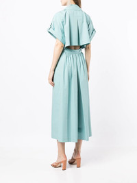 double-breasted trench jumpsuit blue cotton double-breasted button fastening short sleeves wide notch lapels short sleeves tied waist wide leg cropped leg Imported Composition Cotton 100% SIZE & FIT Model measurements Height 5 ft 11 in(1.8 m) Bust/Chest 28.34 in(72 cm) Hips 35.43 in(90 cm) Waist 23.62 in(60 cm) FittingInformation This piece fits true to size. We recommend you get your regular size Designed for a loose fit with a close fit at the waist Made with a mid-weight fabric Washing instructions Dry Clean Only