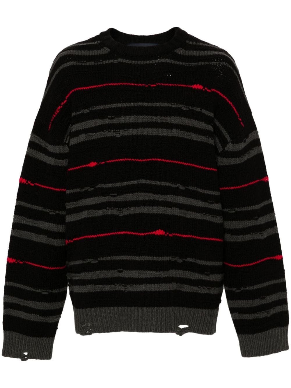 drop-shoulder striped jumper Highlights - Black/multicolour - Knitted construction - Ripped detailing - Horizontal stripe pattern - Ribbed crew neck - Drop shoulder - Long sleeves - Ribbed cuffs and hem Imported Composition Acrylic 52%, Wool 48% SIZE & FIT Model measurements Height 6 ft 2 in(1.88 m) Bust/Chest 36.61 in(93 cm) Hips 35.82 in(91 cm) Waist 27.95 in(71 cm) FittingInformation Designed to be unstructured, offering a loose fit throughout Made with a midweight knit, this piece offers some stretch This piece fits true to size – take your usual size