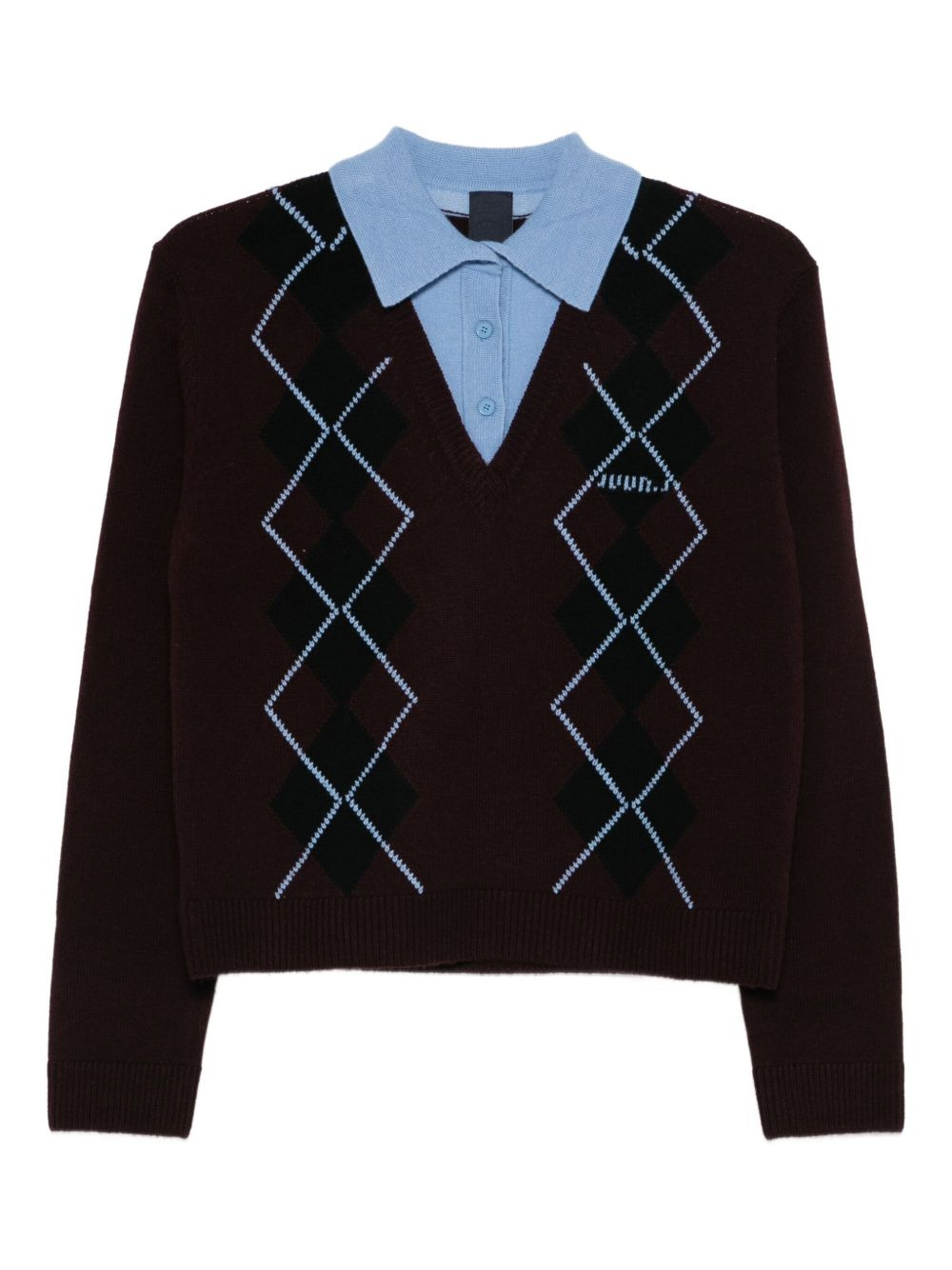 logo-detailing sweater Highlights - Wine red - Argyle pattern - V-neck - Long sleeves - Ribbed hem - Ribbed cuffs Imported Composition Wool 92%, Cashmere 8% Washing instructions Read Manufacturer Guidelines