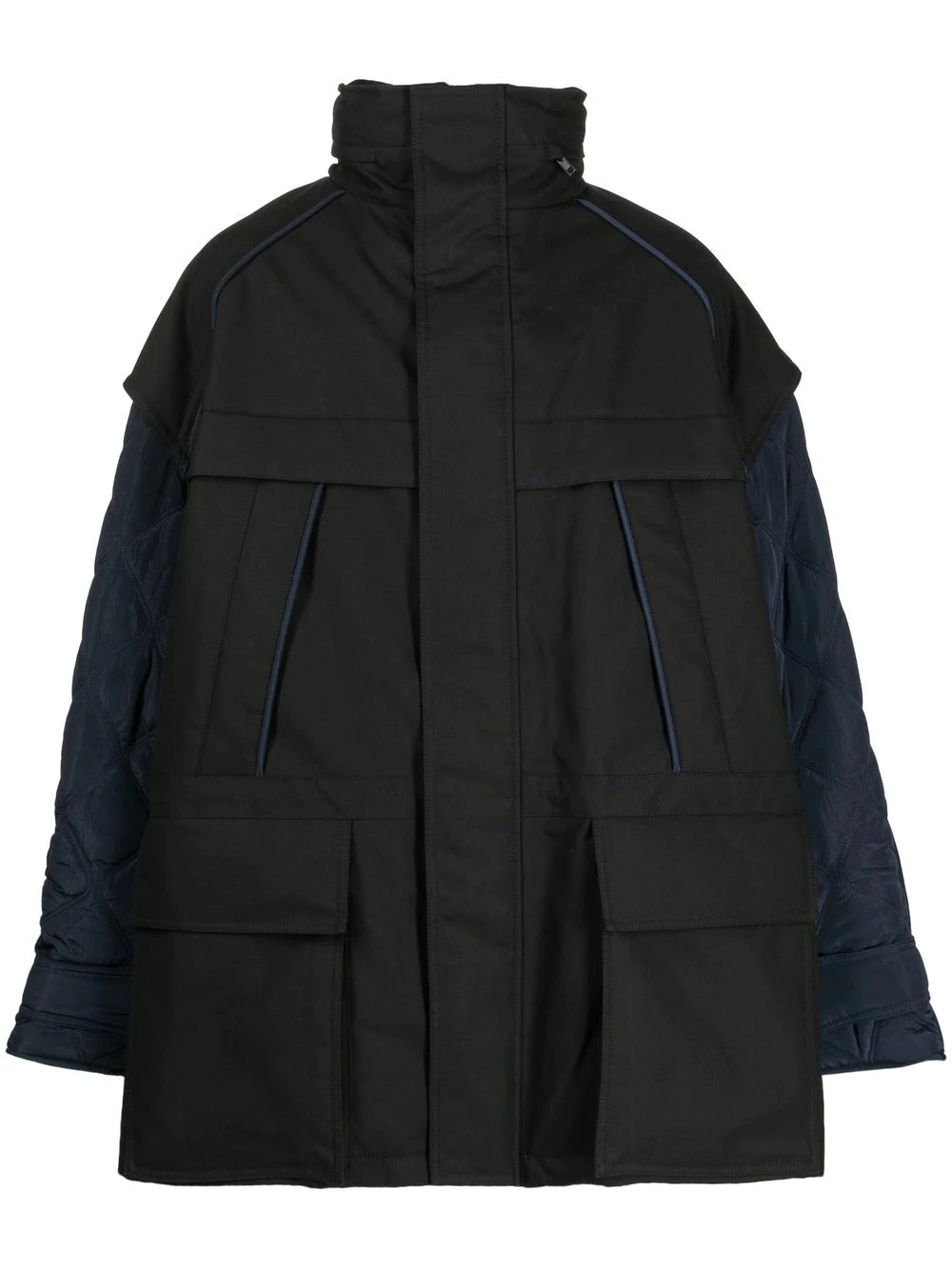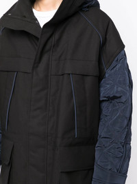 zip-up padded jacket jet black cotton blend padded design quilted panels high neck classic hood front press-stud and zip fastening long sleeves two chest flap pockets two front flap pockets straight hem Imported Composition Body: Cotton 100% Lining: Nylon 100% Filling: Polyester 100% SIZE & FIT Model measurements Height 6 ft 2 in(1.87 m) Bust/Chest 34.25 in(87 cm) Hips 36.22 in(92 cm) Waist 29.52 in(75 cm) FittingInformation This piece fits true to size. We recommend you get your regular size Cut for an oversized fit Made with a heavyweight non-stretch fabric Washing instructions Dry Clean Only
