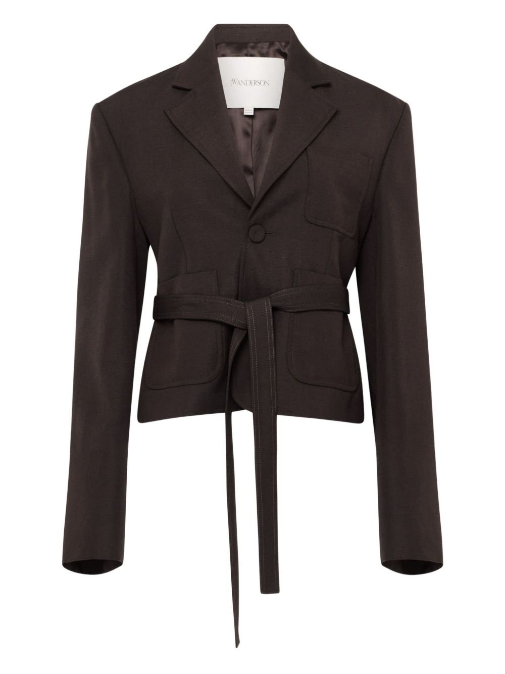 belted pocket jacket Highlights - Dark brown - Self-tie belt - Patch pockets - Notched lapel - Single-breasted closure - Long sleeves Imported Composition Viscose 98%, Silk 2%