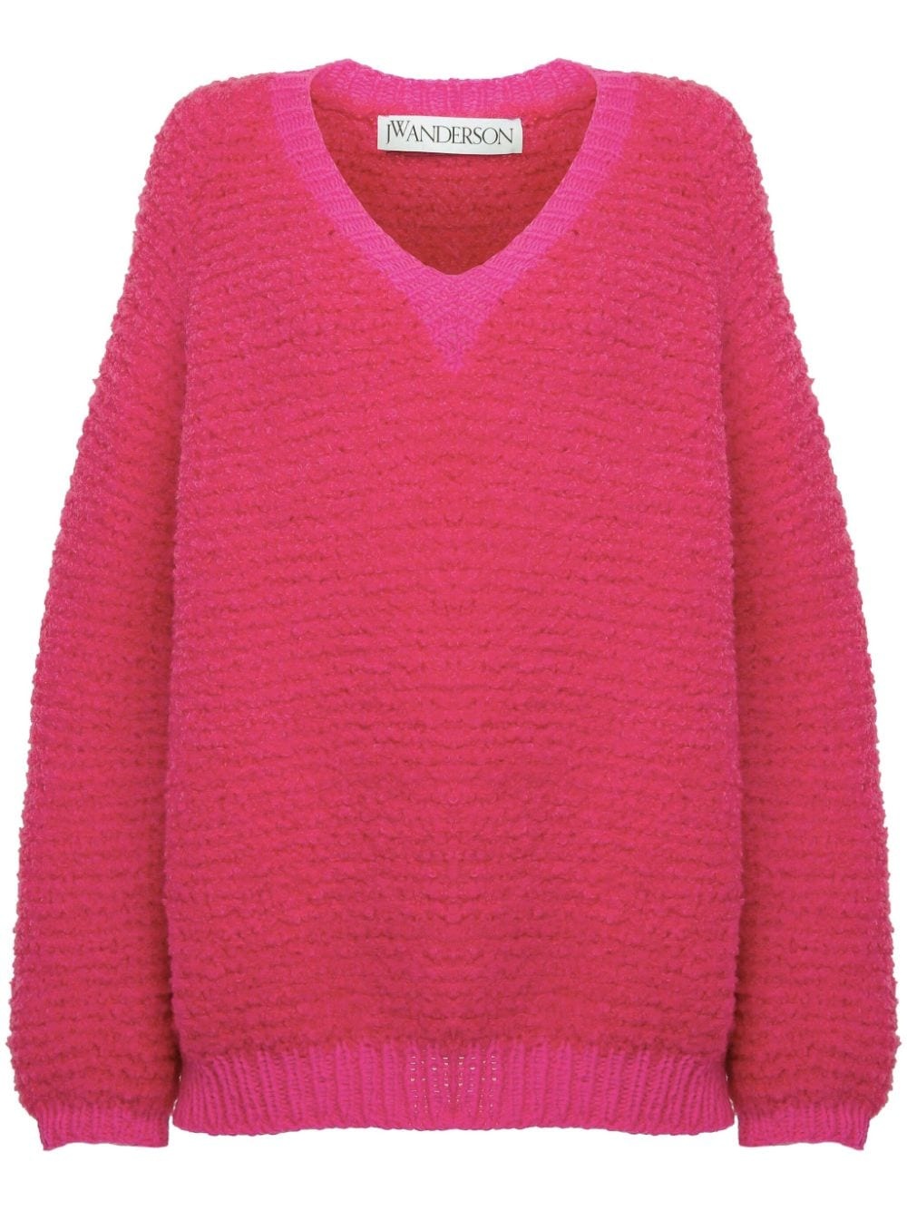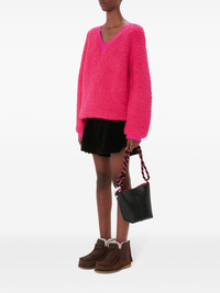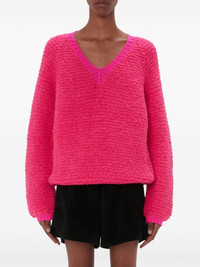boucle V-neck sweater Highlights - Hot pink - Wool-mohair blend - Logo plaque - Ribbed detailing - Contrasting trim - V-neck - Long sleeves - Straight hem Imported Composition Polycarbonite 46%, Wool 28%, Mohair 18%, Polyamide 8% Washing instructions Dry Clean Only