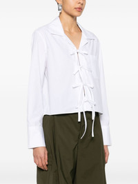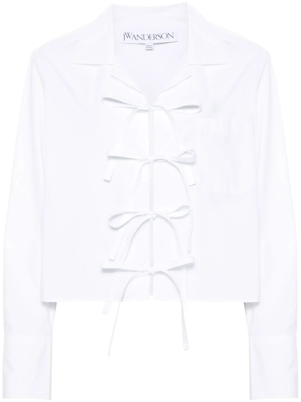 bow-tie cotton cropped shirt Highlights - White - Cotton - Poplin texture - Notched collar - Long sleeves with buttoned cuffs - Pleat detailing at the sleeve - Bow detailing - Chest patch pocket - Rear signature jw-initials anchor embroidered logo - Box-pleat detail - Short side slits - Cropped - Unlined - Straight hem - Self-tie fastening Imported Composition Cotton 100% SIZE & FIT Model measurements Height 5 ft 9 in(1.76 m) Bust/Chest 31.88 in(81 cm) Hips 35.43 in(90 cm) Waist 24.8 in(63 cm) FittingInformation Designed to be unstructured, offering a loose fit throughout The tie fastening gives an adaptable and personalised fit Made from a midweight non-stretch fabric This piece fits true to size – take your usual size