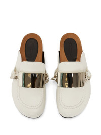Gourmet Chain mules JW Anderson reimagines its signature footwear silhouette for SS23, as shown by the updated hardware found on the Gourmet Chain mules. Made in Italy from smooth calf leather, the pair is adorned with a polished and flattened plaque at the centre whilst sitting atop a flat rubber sole. Made in Italy Composition Leather 100% SIZE & FIT Measurement HEEL 0.78 in(2 cm) Sole height 0.39 in(1 cm)