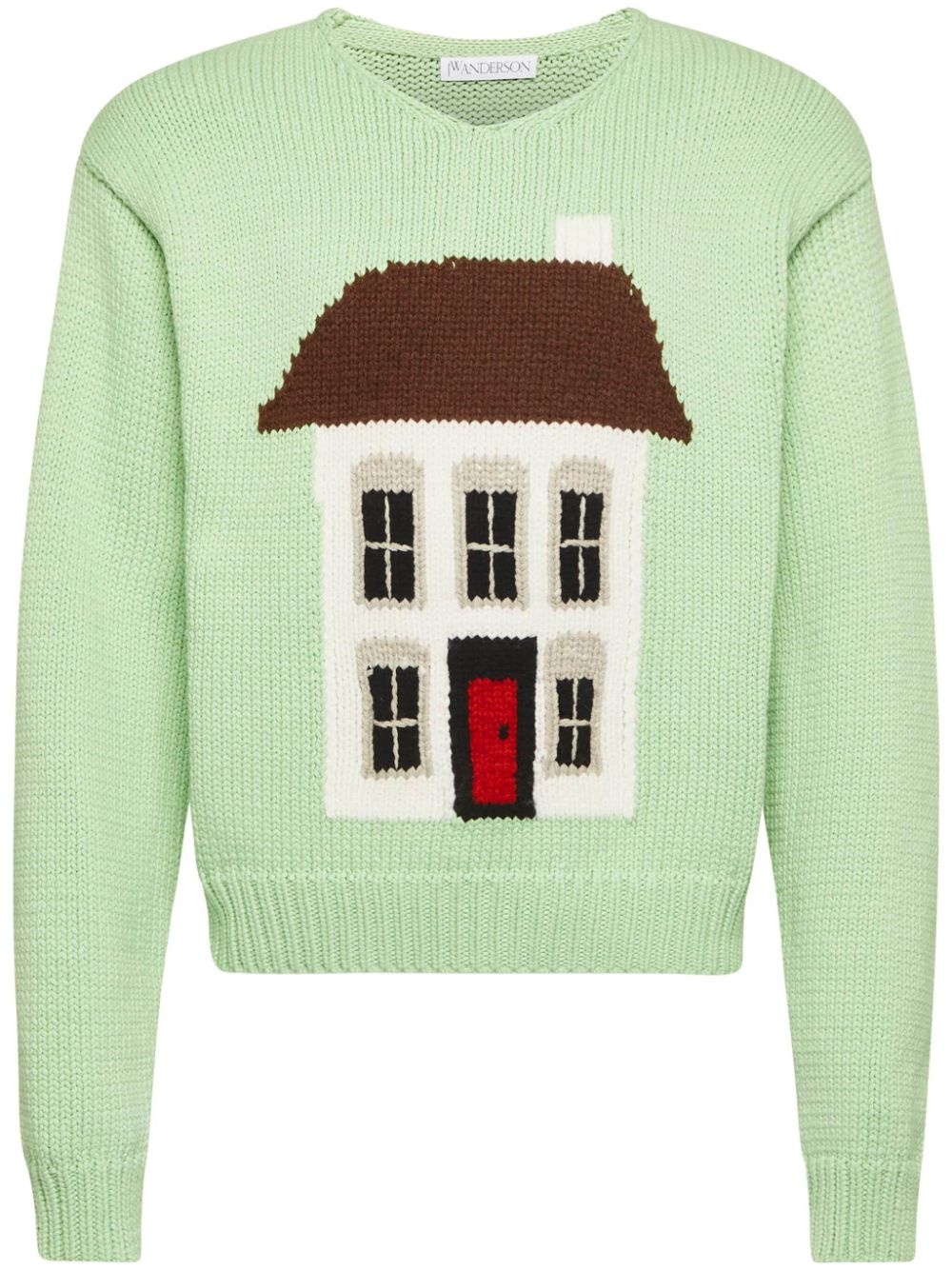House-intarsia sweater Highlights - Mint green - Cotton blend - House intarsia knit - V-neck - Drop shoulder - Long sleeves - Logo plaque - Ribbed cuffs and hem Imported Composition Cotton 70%, Polyamide 30% Washing instructions Read Manufacturer Guidelines