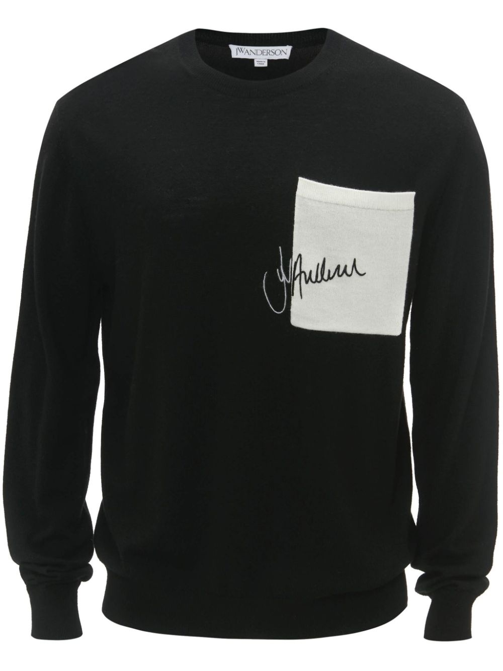 logo-embroidered crew-neck jumper Highlights - Black/white - Merino wool - Fine knit - Embroidered logo at the chest - Crew neck - Long sleeves - Ribbed cuffs and hem - Chest patch pocket - Straight hem Imported Composition Merino 100% Washing instructions Read Manufacturer Guidelines