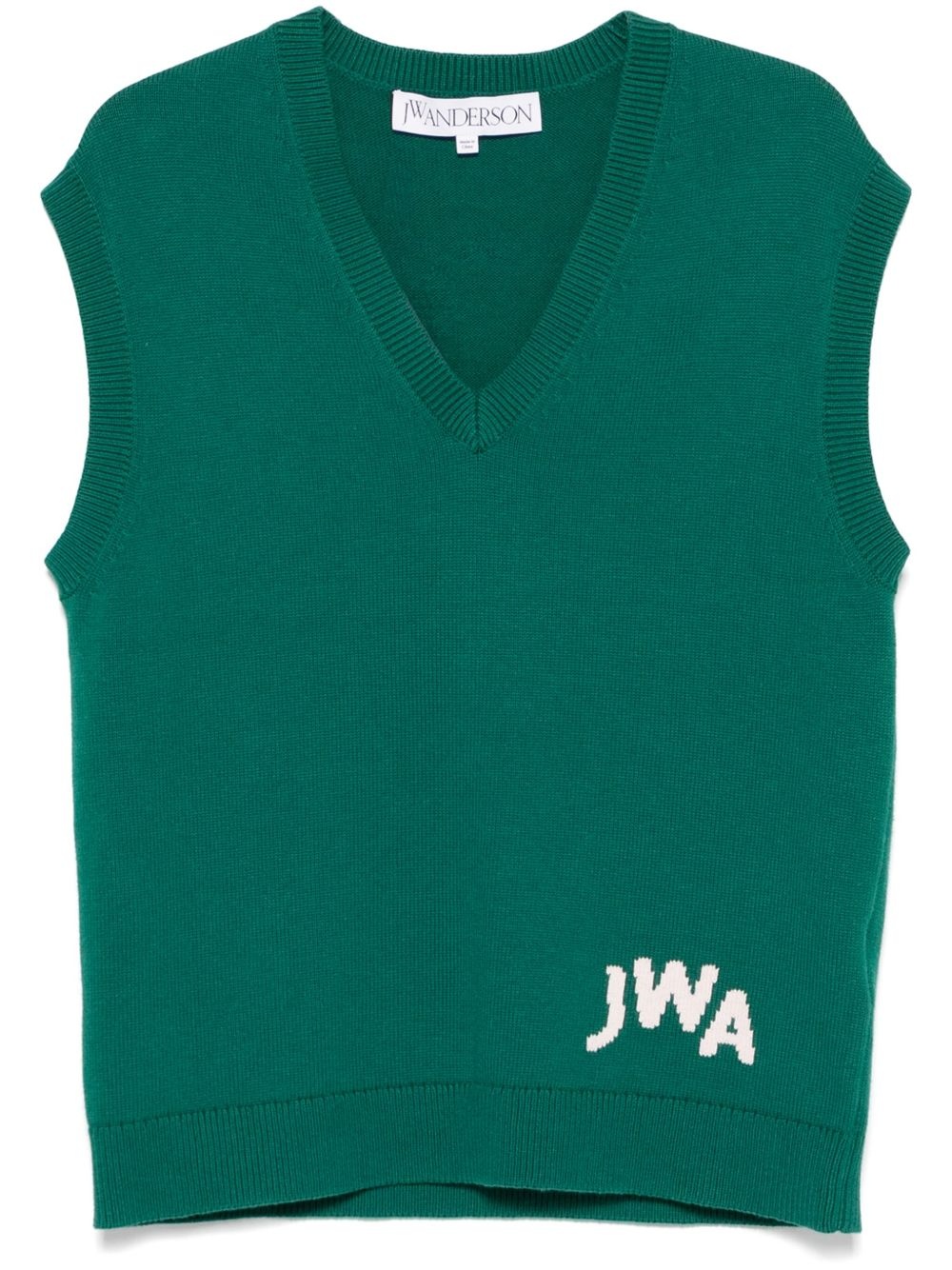 logo-intarsia vest Highlights - Emerald green - Ribbed v-neck - Sleeveless - Ribbed cuffs and hem Imported Composition Cotton 95%, Cashmere 5% SIZE & FIT Model measurements Height 6 ft 2 in(1.87 m) Bust/Chest 36.41 in(92.5 cm) Hips 35.43 in(90 cm) Waist 29.52 in(75 cm) FittingInformation Designed for a relaxed fit, this piece allows for comfort and movement when worn Made with a midweight knit, this piece offers some stretch