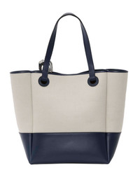 logo-stamp leather tote bag Highlights - Navy blue/light grey - Calf leather - Two flat top handles - Logo stamp to the front - Open top - Magnetic fastening - Main compartment - Suede lining - Internal slip pocket - Silver-tone hardware Imported Composition Outer: Acrylonitrile Butadiene Styrene (ABS) 90%, CALFSKIN 70%, Cotton 30%, Zamak 10% Lining: Suede 60%, Cotton 40% SIZE & FIT Measurement DEPTH 7.48 in(19 cm) HANDLE 9.44 in(24 cm) HEIGHT 12.59 in(32 cm) WIDTH 11.02 in(28 cm)