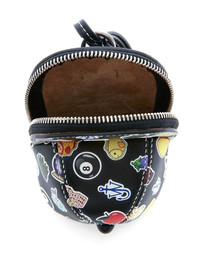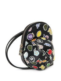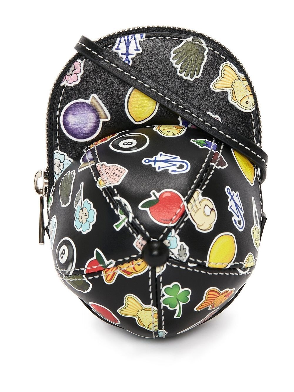 nano Cap cross body bag The Cap bag is a mainstay at JW Anderson, having first appeared in 2019. It is presented in a nano size here, awash with sticker-effect graphics and topped with contrast white stitching. Highlights - Black - Calf leather - All-over graphic print - Adjustable shoulder strap - Top zip fastening - Contrast stitching - Silver-tone hardware - Suede lining Imported Composition Outer: CALFSKIN 100%