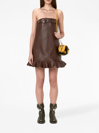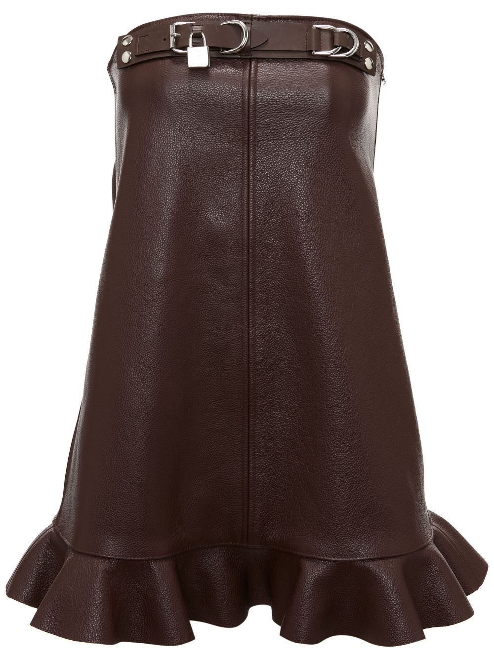 padlock-detail leather minidress Made from grained leather, this minidress by JW Anderson captures the brand's distinguished aesthetic. While the buckle strap with a padlock adds a modern twist to the design, the straight cut with ruffled trim brings a retro-inspired romantic feel. Highlights - Chocolate brown - Calf leather - Grained texture - Strapless - Buckle-strap fastening - Padlock detail - Silver-tone hardware - Concealed side zip fastening - Ruffled trim - Thigh-length Made in United Kingdom Composition Body: CALFSKIN 100%