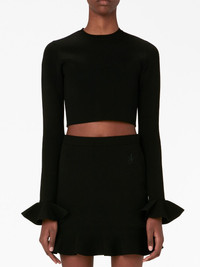 ruffled-cuffs cropped knitted top Highlights - Black pepper - Knitted construction - Crew neck - Long sleeves - Ruffle cuffs - Cropped Made in Italy Composition Viscose 77%, Polyester 17%, Polyamide 5%, Spandex/Elastane 1% SIZE & FIT Measurement SLEEVE LENGTH 20.47 in(52 cm) LENGTH 15.74 in(40 cm) WAIST 30.7 in(78 cm) BUST 27.55 in(70 cm)