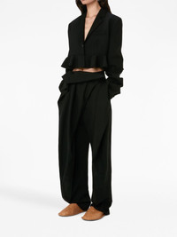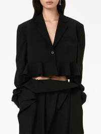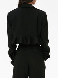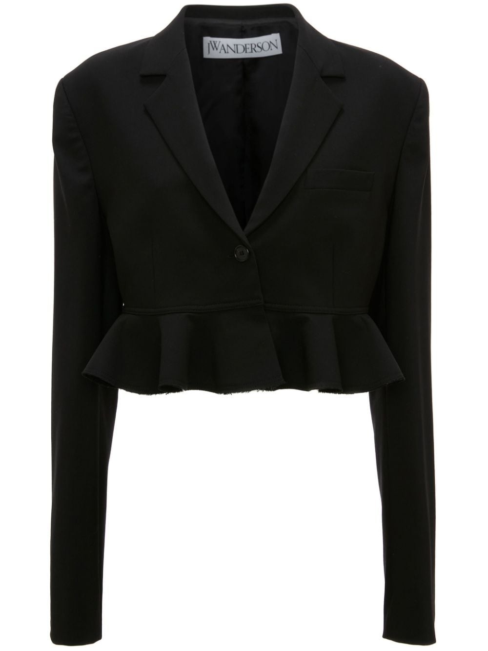 ruffled-trim cropped blazer Imagined in black, this blazer by JW Anderson encapsulates the brand's original style. Spun from a virgin wool blend, the classic single-breasted silhouette gains a fresh look due to the narrow ruffled trim that elevates the cropped cut. Highlights - Black - Virgin wool blend - Notched lapels - Front button fastening - Chest welt pocket - Long sleeves - Buttoned cuffs - Ruffled trim - Cropped Imported Composition Outer: Virgin Wool 93%, Spandex/Elastane 7% Lining: Viscose 100%