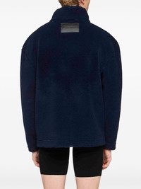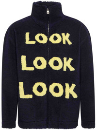 slogan-print jacket Highlights - Navy blue/yellow - Faux shearling - Front zip fastening - High neck - Drop shoulder - Long sleeves - Slogan print to the front - Applique logo - Straight hem Imported Composition Polyester 72%, Acrylic 15%, Wool 13% Washing instructions Read Manufacturer Guidelines