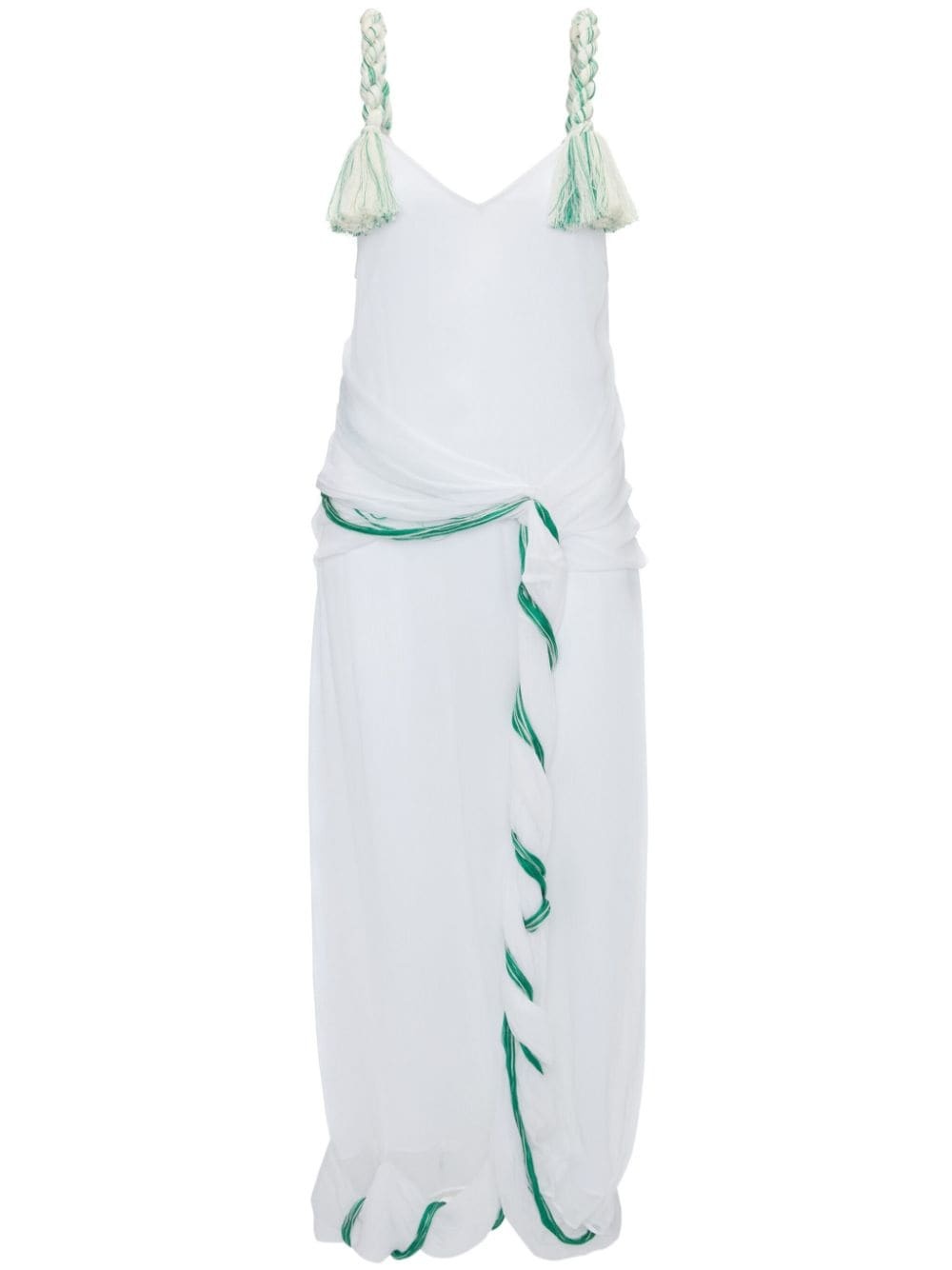 tassel-strap twisted dress Highlights - White - Crepon - Crinkled finish - Tassel detailing - Twist detailing - V-neck - Two braided shoulder straps - Draped detailing - V-back - Asymmetric draped hem Imported Composition Viscose 100%