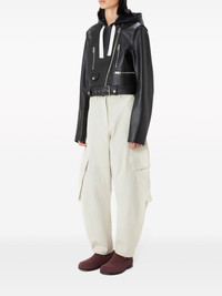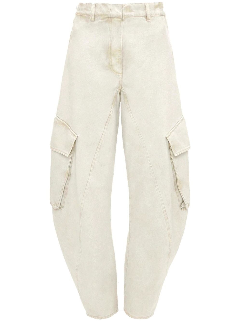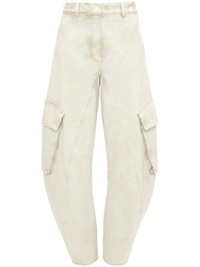 twisted cargo jeans JW Anderson's iconic twisted jeans have returned, now featuring two practical side cargo pockets. Crafted from comfortable cotton, this cream-white design boasts a sleek, minimalist aesthetic, enhanced by a subtle leather logo applique at the back. Highlights - Cream white - Cotton - Applique logo - High-waisted - Belt loops - Concealed front fastening - Two side cargo pockets - Two rear welt pockets - Tapered leg Imported Composition Cotton 100% Washing instructions Read Manufacturer Guidelines