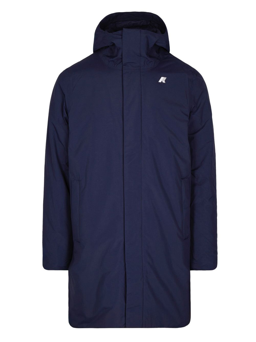 hooded long-sleeves coat Highlights - Navy blue - Hooded neckline - Front zip fastening - Long sleeves - Logo patch - Straight hemline Imported Composition Nylon 100% Washing instructions Read Manufacturer Guidelines