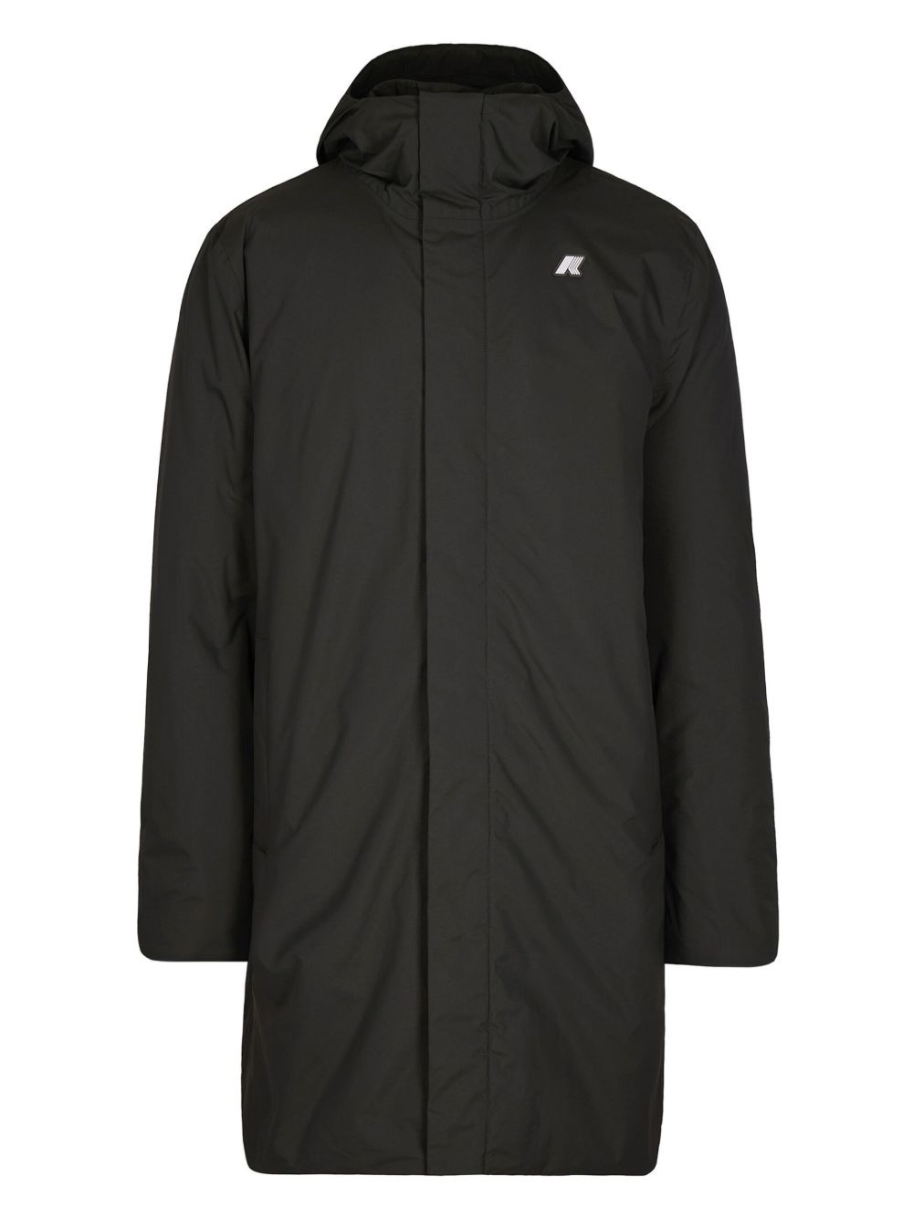 hooded long-sleeves coat Highlights - Black - Hooded neckline - Concealed front fastening - Long sleeves - Logo patch - Straight hemline Imported Composition Nylon 100% Washing instructions Read Manufacturer Guidelines