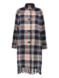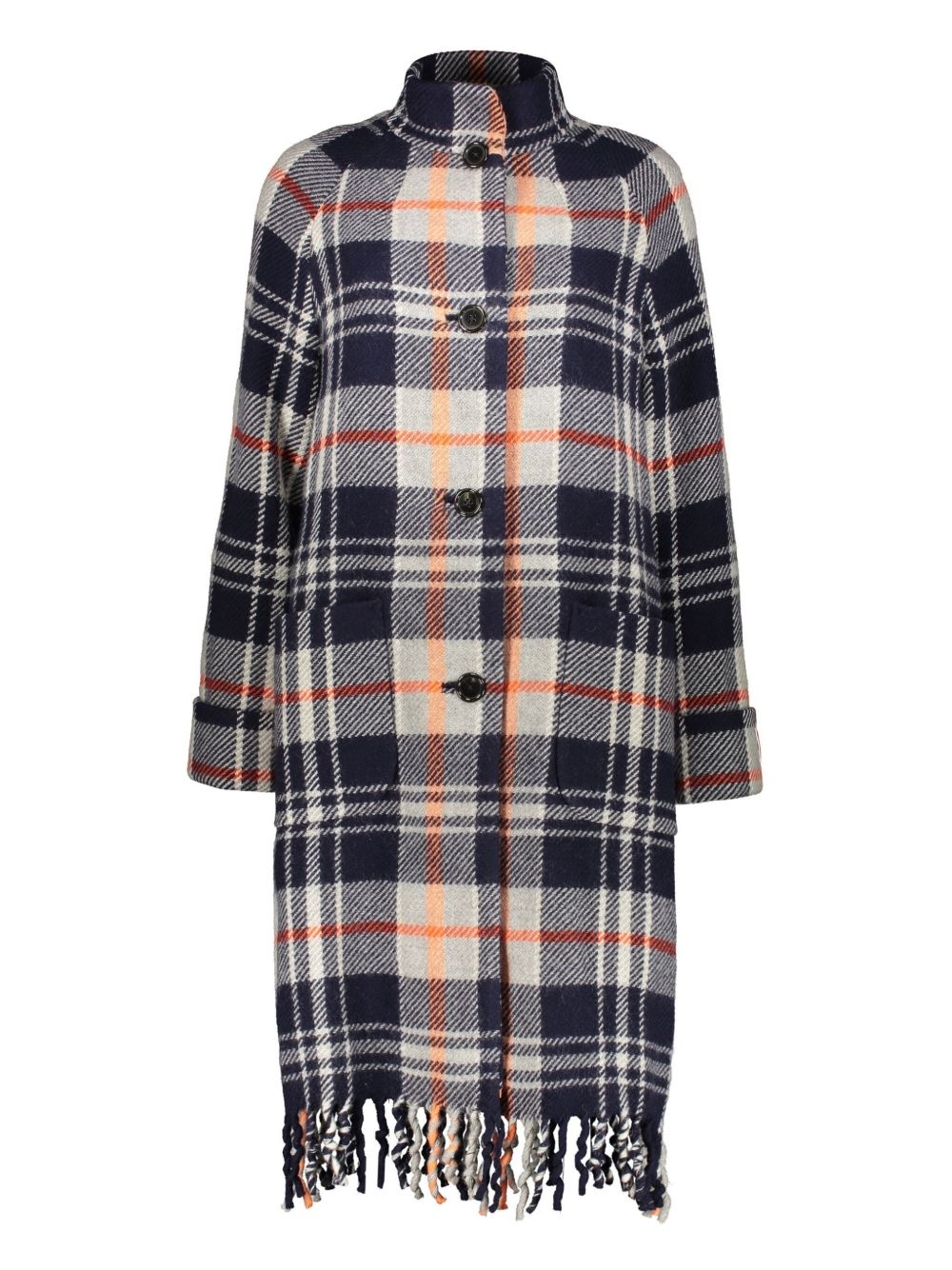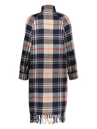 checked wool coat Highlights - Navy blue - Front button fastening - Two side patch pockets - Long sleeves - Fringed edge Imported Composition Lining: Acetate 60%, Cupro 40% Outer: Wool 100%