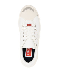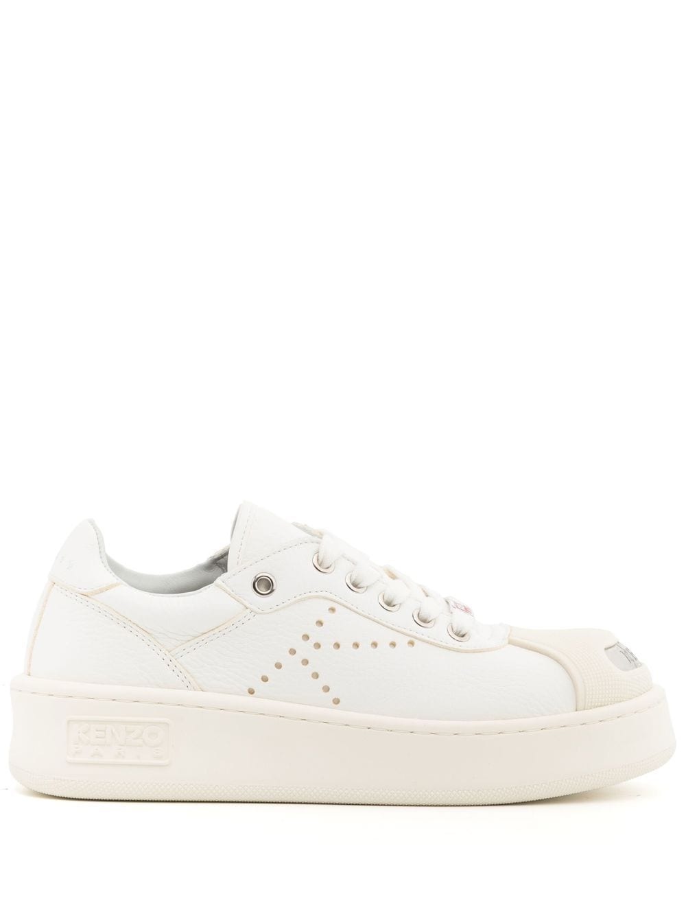 contrasting-toecap low-top sneakers The Kenzo 'Hoops' trainers are presented in a versatile white hue with a chunky sole. Kenzo's logo is featured heavily throughout the design in various styles. This includes a perforated 'K' to the side and a silver-toned debossed logo plaque to the front. Imported Composition Leather 100% SIZE & FIT Measurement Sole height 1.37 in(3.5 cm) Washing instructions Do Not Wash/Do Not Dry Clean