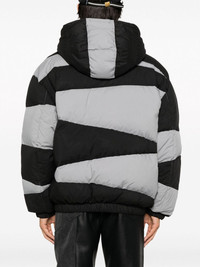 Dazzle Stripe padded jacket Highlights - Black/grey - Feather down - Padded design - Quilted - Panelled design - Logo patch at the chest - Funnel neck - Classic hood - Long sleeves - Two side inset pockets - Elasticated cuffs - Straight hem Imported Composition Outer: Polyester 100% Lining: Feather Down 100%, Nylon 100% SIZE & FIT Model measurements Height 6 ft 2 in(1.89 m) Bust/Chest 37.79 in(96 cm) Hips 37 in(94 cm) Waist 29.92 in(76 cm) FittingInformation Designed to be unstructured, offering a loose fit throughout The elasticated hem allows for movement and a comfortable fit Made from a padded non-stretch fabric, giving it no natural elasticity This piece fits true to size – take your usual size Washing instructions Dry Clean Only