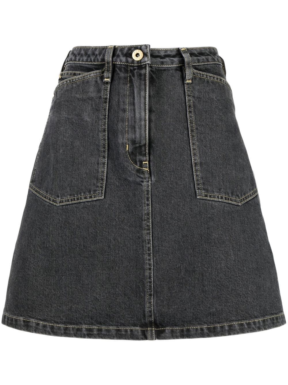 high-waisted bleached denim skirt black stretch-cotton bleach wash contrast stitching logo patch to the rear front button and zip fastening two front patch pockets two rear patch pockets belt loops adjustable strap to the rear high-waisted A-line skirt Imported Composition Cotton 99%, Elastane 1% SIZE & FIT Model measurements Height 5 ft 9 in(1.76 m) Bust/Chest 29.13 in(74 cm) Hips 33.07 in(84 cm) Waist 22.83 in(58 cm) FittingInformation This piece fits true to size. We recommend you get your regular size Cut for a slim fit Made with a mid-weight stretch fabric Washing instructions Machine Wash