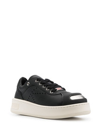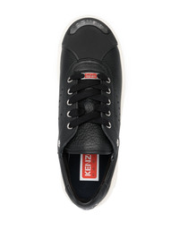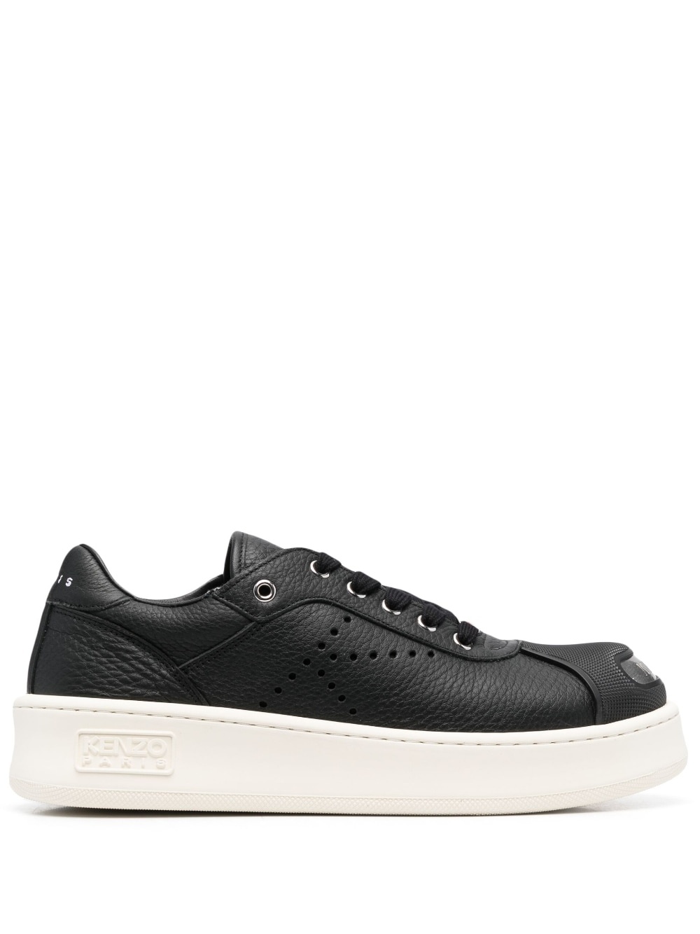 Hoops logo-plaque sneakers The Kenzo 'Hoops' trainers are presented in a versatile black hue with a contrasting chunky white sole. Kenzo's logo is featured heavily throughout the design in various styles. This includes a perforated 'K' to the side and a silver-toned debossed logo plaque to the front. Highlights - Black - Calf leather - Perforated logo detail - Embossed logo to the front - Logo-engraved shoelace tag - Logo print to the rear - Front lace-up fastening - Round toe - Branded footbed - Contrasting rubber sole - Embossed logo sole Imported Composition Lining: Calf Leather 100%, Fabric 100% Outer: Calf Leather 100% Sole: Rubber 100% SIZE & FIT Measurement HEEL 1.96 in(5 cm) Sole height 0.98 in(2.5 cm)