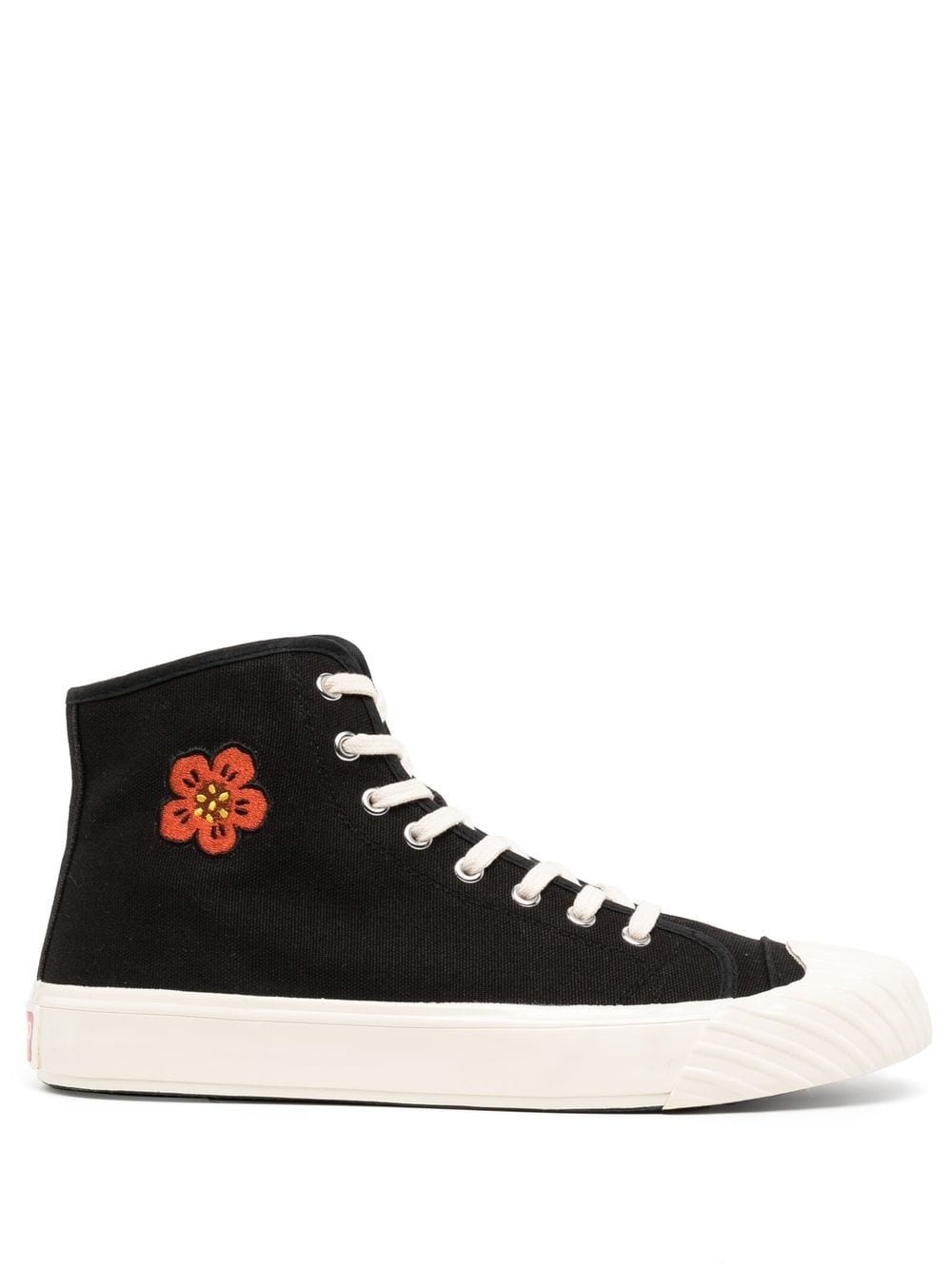 Kenzoschool high-top sneakers Designed in a monochrome colourway, the Kenzoschool sneakers are defined by their high-top silhouette and tonal construction - a testament to the brand's contemporary and youthful approach to accessories. Sitting atop a flat rubber sole, they're adorned with an embroidered floral motif at the side. Highlights - Black - Canvas - Logo to the heel - Floral embroidery - Round toe - Front lace-up fastening - Side zip fastening - Branded footbed - Flat rubber sole Imported Composition Sole: Rubber 100% Outer: Fabric 100% Inner: Fabric 100% SIZE & FIT Measurement HEEL 1.18 in(3 cm) Sole height 0.98 in(2.5 cm) HEIGHT 3.74 in(9.5 cm)