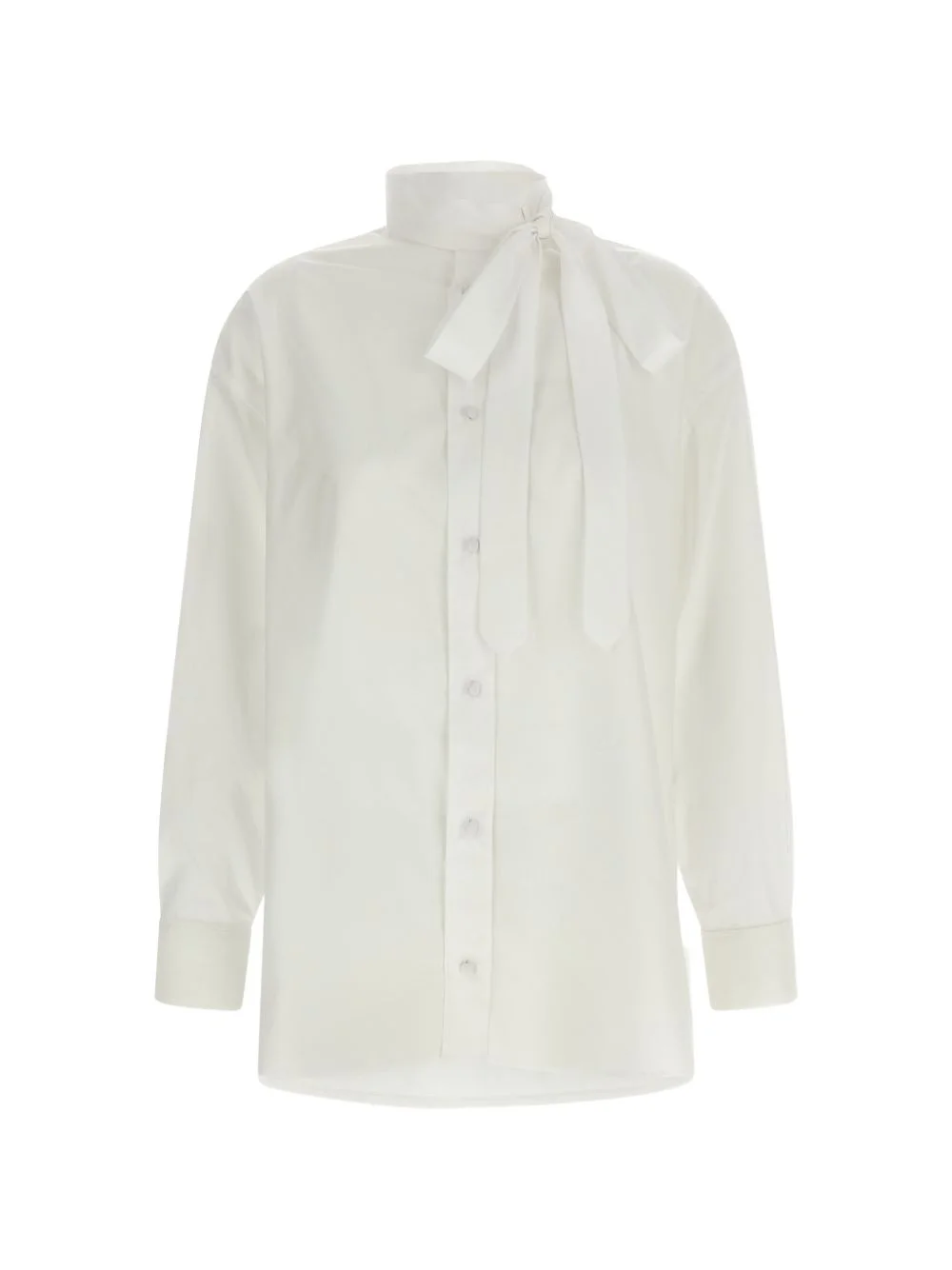 lavalliere collar embroidered shirt Highlights - White - Lavalliere collar - Embroidered logo - Front button closure - Long sleeves - Side slits Imported Composition Cotton 100% Washing instructions Read Manufacturer Guidelines